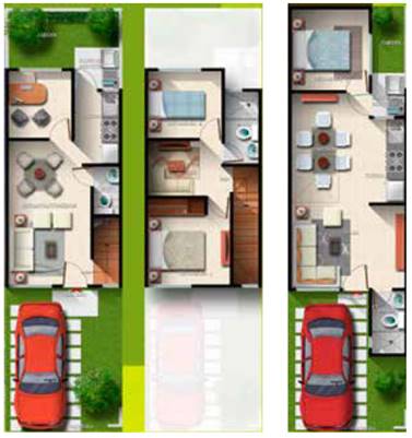 Modelo Cedrón, tiene una superficie de terreno de 60 m2 con un frente de 4 mts y 15 mts de profundidad, y una superficie construida de 60.72 m2 en dos niveles. El programa arquitectónico incluye: 2 recamaras, sala de TV, estudio, sala, comedor, cocineta, patio de servicio, estacionamiento y jardín trasero.