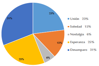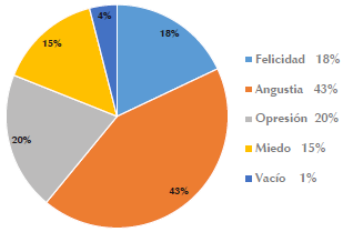 El sentido de satisfacción personal asociada al espacio o lugar, este fue analizado con un abanico de conceptos como: felicidad, angustia, opresión, miedo y vacío. De esta variable, los mayores porcentajes (cuya suma es 63%) oscilan entre una percepción de opresión o de angustia, mientras las respuestas menos frecuentes se inclinan hacia la felicidad, el miedo o el vacío (Figura 6).