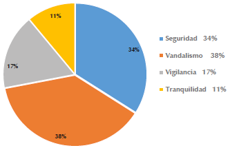 Existen muchas referencias antropológicas que sustentan la necesidad de que, ante la percepción de vulnerabilidad, el hombre requiere sentirse protegido. Este aspecto no parece estar cubierto en este conjunto habitacional, ya que el concepto “vandalismo” fue reiterativo en un 38%, en contraste con el de seguridad (34%) o el de vigilancia (17%). (Figura 8)