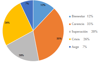 Los conceptos presentados como: bienestar, carencia, superación crisis y auge se les encuentra ligados con la autovaloración y el respeto a sí mismo. Los resultados arrojaron que en un 35% la gente se percibe en una situación de carencia, sobre todo esto se concentró más en aquellos habitantes que viven en el Modelo Malva, de considerables reducidas dimensiones. Esto se suma a la idea de crisis con un 20%, nuevamente se privilegia la percepción negativa que se tiene de las casas del fraccionamiento. Finalmente fueron reducidas las respuestas que se inclinaron hacia la idea de bienestar, superación y auge (Figura 9).