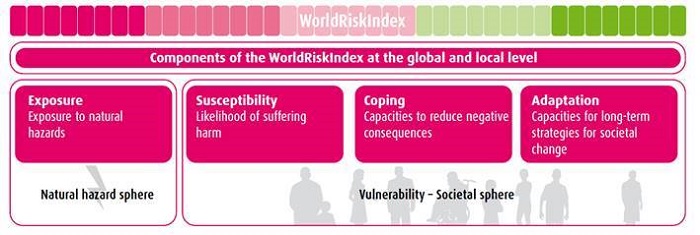 El World Risk Index se basa en entender que el núcleo de riesgos de desastres de una sociedad está influenciada por la estructura, los procesos y el marco de condiciones o contexto, que a su vez pueden ser afectados por fenómenos naturales y los efectos del cambio climático, como se observa en la figura 1. Una ventaja que el índice tiene es su estructura modular basada en cuatro componentes:
