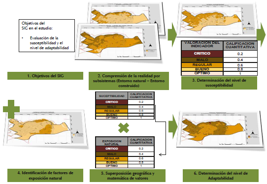El montaje del SIG (Sistema de Información Geográfico) a partir del uso de los indicadores propuestos en la matriz de adaptabilidad, nos permite tener una información alfa - numérica espacializada del territorio, dando como resultado una visión más real del estado del sistema en términos de susceptibilidad. Para tal fin se ha diseñado un modelo cartográfico el cual plantea la forma de ir cruzando y analizando información por niveles de jerarquía. Éste modelo cartográfico es utilizado para esquematizar el uso de las funciones de un Sistema de Información Geográfica, bajo una secuencia lógica en la solución de problemas espaciales complejos. Estos modelos se basan en ir cruzando información multivariada de cada uno de los subsistemas analizados; esto quiere decir que cada subsistema tendrá como primer resultado un mapa de cruce de todos los indicadores analizados, que finalmente resultan en los mapas síntesis denominados Entorno natural y Entorno construido. La metodología permite ir cruzando información según las relaciones establecidas en la matriz para determinar el nivel de adaptabilidad del asentamiento urbano.