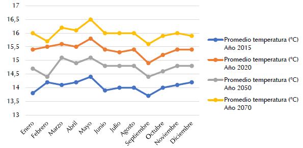 De esta manera se realizan cuadros climáticos de las bases obtenidas de los años 2015, 2020, 2050 y 2070, realizadas con la herramienta CC Weather Gen, IDEAM y Meteonorm, en los que se compararon factores meteorológicos como: humedad relativa, temperatura, radiación direc ta y difusa, nubosidad, precipitación, cuyo resul tado permitió construir una matriz comparativa de los datos más representativos. Para el caso de estudio, la metodología proyecta resultados del clima de Soacha, que se registran en la Figura 2, en la que se evidencia un aumento de 2,1 °C en la temperatura en este periodo de tiempo.