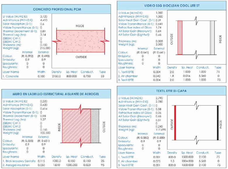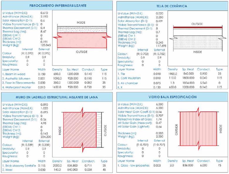 Considerando lo anterior, y para dar conti nuidad a la metodología, fueron asignados los materiales de las superficies que conforman la espacialidad de la vivienda (muros, cubierta, ele mentos translúcidos y el suelo) con sus respectivos valores de coeficientes de conductividad térmica, densidad, calor específico, reflectividad y absortancia de las superficies. Los valores fueron verifi cados y ajustados según las fichas técnicas de cada material seleccionado, para tener certeza de que los resultados térmicos correspondan en compo sición y coeficientes técnicos a las características de los materiales analizados inicialmente, y al contexto de nuestro país (Figuras 3, 4 y 5).