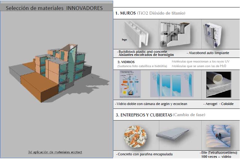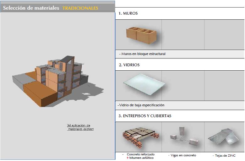 Una vez el proyecto arquitectónico tenía definida una estructura espacial, se procedió a desarrollar la tercera fase correspondiente al modelado de tres prototipos con materiales envolventes diferentes, escogidos de las matri ces. La selección de estos surgió, en el caso de los materiales clasificados como tradicionales, del uso habitual de los mismos en la vivienda dentro del país; los de vanguardia, de acuerdo con los que presentaban mejores características aislantes y de fácil acceso por su economía; y por último, los innovadores, que fueron seleccio nados teniendo en cuenta sus coeficientes tér micos y sus ventajas de adaptación frente a la contaminación y adversidad climática.