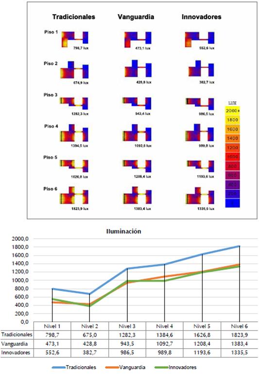 En la Tabla 1 se muestra un resumen de los resultados obtenidos, los respectivos promedios generales de cada grupo de materiales, así como el porcentual de lux por piso obtenido de las simulaciones.