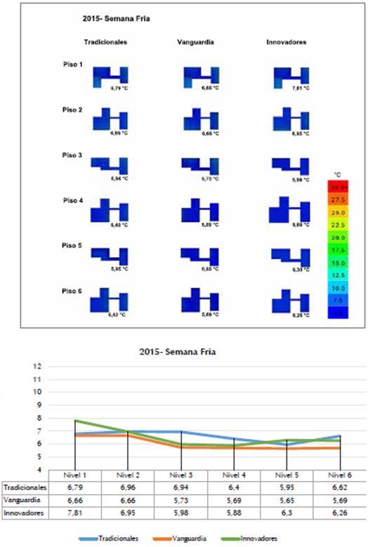 A continuación se presentan las simulaciones de semanas frías promedio por año, las cuales se orde nan cronológicamente desde la base 2015 a 2070 (Figuras 13 a 16). La información se organizó en una matriz que establece en su primera fila superior la clasificación de materiales, y en la primera fila del costado izquierdo el piso simulado; así, dentro de la matriz se encuentra cada piso simulado en planta con su respectivo promedio en °C, dejando en el costado inferior derecho una escala de convención para los colores representados en las plantas.