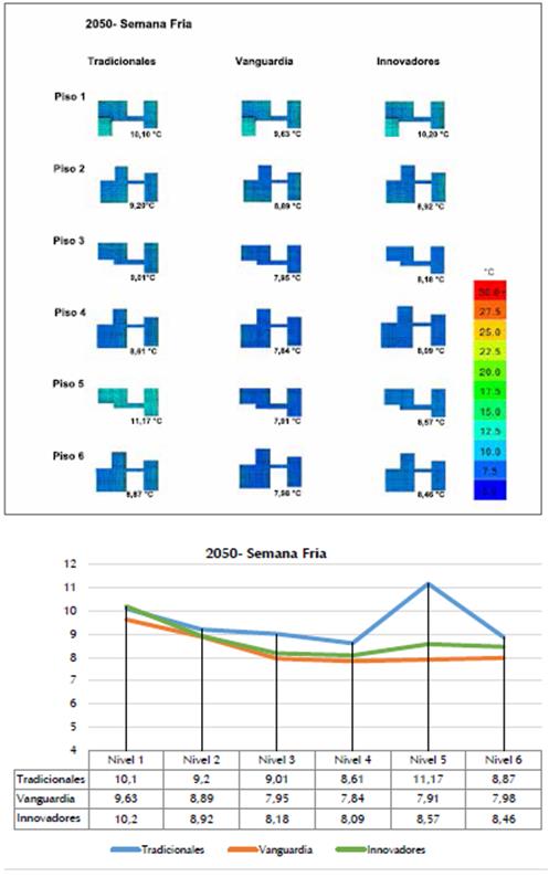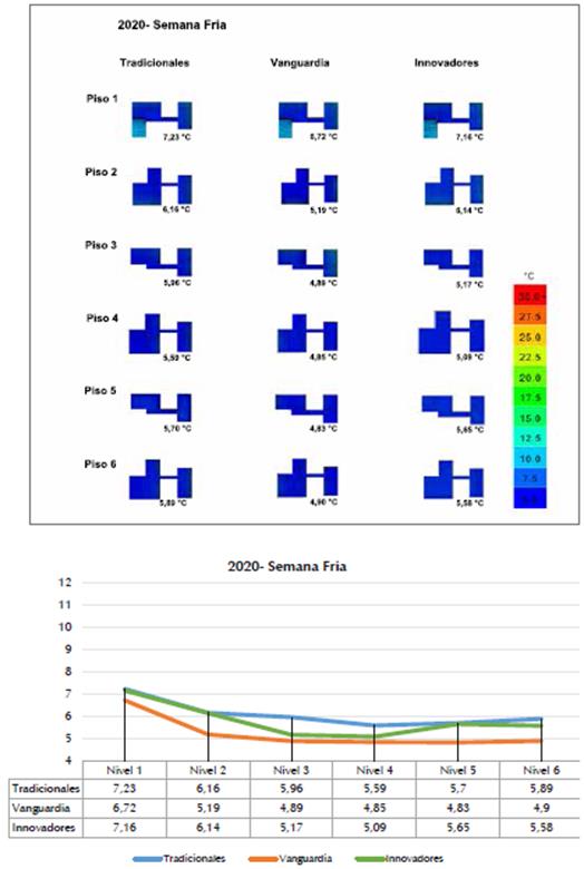 Para el caso de las simulaciones de semana fría se observa un mejor comportamiento de cobijo ante las condiciones climáticas por parte de los materiales tradicionales, seguidos por los materia les clasificados como innovadores; los materiales de vanguardia fueron los más lejanos al rango de confort.