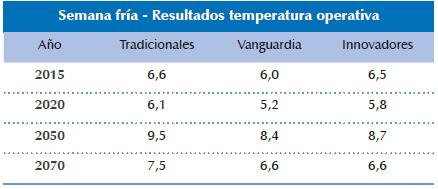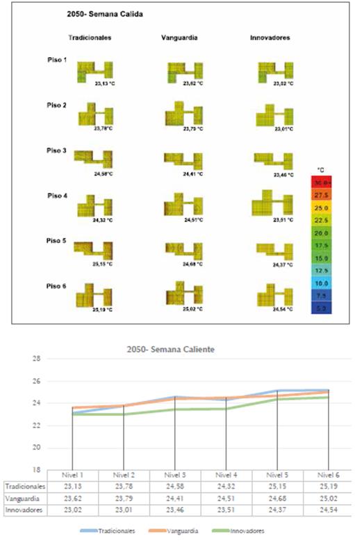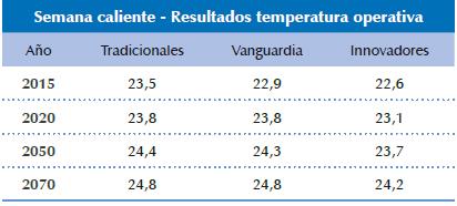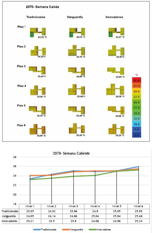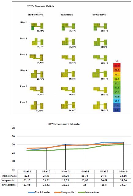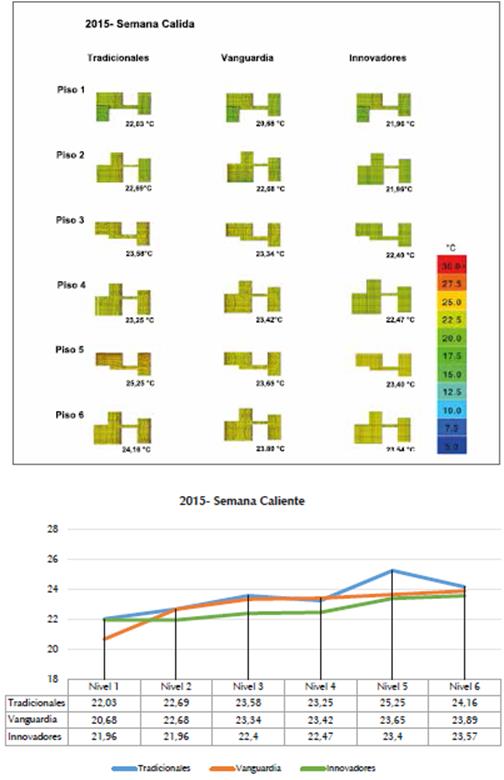 Las simulaciones de semana caliente evidencia ron una marcada tendencia de los materiales cla sificados como innovadores para mantener más fresca la temperatura operativa de los espacios; siguieron los materiales de vanguardia que se encuentran balanceados, y los tradicionales que daron como los menos eficientes ante el calor.