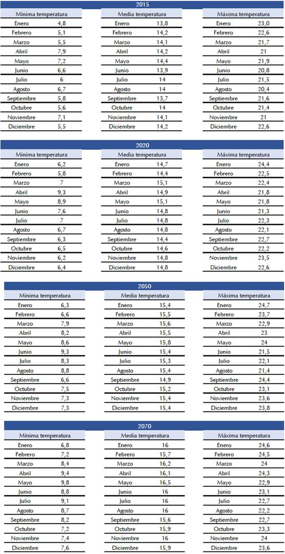 Además, como es mencionado por Vahid y Jesper (2017, p. 617), evaluar los impactos del cambio climático es simular los fenómenos estudiados utilizando el futuro de escenarios climáticos, por lo tanto, se obtienen bases climáticas de los siguientes 55 años de vida útil de la edificación, interpolados de manera aleatoria desde la fecha de inicio de esta investigación, así: 2015, 2020, 2050 y 2070, lo que, por un lado, evidencia los impactos del cambio climático, y, por el otro, establece el contexto de problema de este estu dio. De la misma forma, la obtención de las bases climáticas se basa en lo expuesto por Erbaa, Causone y Armani (2017, p. 547) quienes asocian el resultado de simulaciones más precisas con la consecución de bases de datos comparativas de varias fuentes primarias.