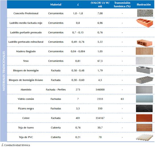 La construcción de dichas matrices permitió profundizar en algunos conceptos de termodiná mica, comprender las condiciones físicas de los materiales e interpretar la información presenta da en las fichas técnicas. Por ejemplo, se anali zaron conceptos como: 1) el valor U, que es el coeficiente que establece el intercambio de ener gía en forma de calor entre distintos cuerpos, o entre diferentes partes de un mismo cuerpo que se encuentran a distinta temperatura. Teniendo en cuenta las formas de trasferencia de calor, ya sea mediante convección, radiación o conduc ción. 2) El coeficiente de conductividad térmica, el cual está ligado a la velocidad de calentamien to o enfriamiento. 3) La efusividad térmica, que es la capacidad para acumular energía térmica, una alta efusividad está ligada a una gran masa térmica tiene mayor facilidad para calentarse y acumular como la piedra, una baja efusividad está ligada a la poca capacidad de acumular, son mejores aislantes como el aire. 4) Coeficiente de transmisión luminosa y radiación solar dentro del espectro visible de 0 a 100% entre mayor el porcentaje mayor entrada de luz, mayor transpa rencia, relacionada con la unidad de medida de la iluminación (lux).