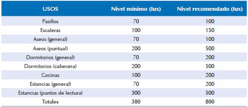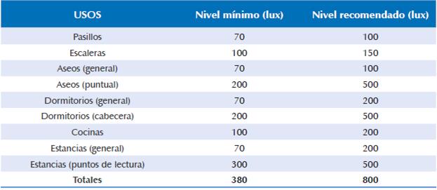 Por otro lado, con base en Retilap (Resolución 180540), en la Tabla 2 se establecen valores lux mínimos y recomendados para vivienda. Dado que el diseño arquitectónico del proyecto obje to de esta investigación contemplaba espacios abiertos, omitiendo el uso de muros divisorios, se opta por sumar los valores de las dependen cias marcadas en azul dentro de la Tabla 2, que serían las mismas que conforman los espacios en cuestión de cada unidad habitacional.