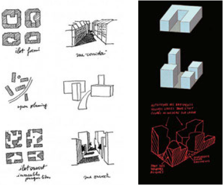 Las soluciones propuestas durante el siglo XIX, como la ciudad hausmanniana y su sistema de manzanas cerradas, pueden ser comparadas retrospectivamente con las barras producidas durante el siglo XX: así lo ha hecho Christian de Portzamparc (1944-), estableciendo una "edad 1" de la ciudad moderna caracterizada por la continuidad de su tejido y de sus calles-corredor, a la cual se opone una "edad 2" caracterizada por la dispersión del espacio con edificios discretos separados por superficies amorfas. A estas se suma la denominada "edad 3", de la cual el propio Portzamparc se erigió como estandarte con su concepto de "îlot ouvert" (manzana abierta) (Figuras 25 y 26); aunque poco se ha defendido la importancia de lo que me atrevo a denominar la "edad 1,5" que agrupa todas aquellas tentativas con las cuales se buscó transformar la ciudad de los primeros años de la era industrial y que no se reducen a la simple yuxtaposición de torres y de barras: podemos citar en esta "edad 1,5" las grandes manzanas propias de los planes alemanes desarrollados antes de 1914 ; el plano de Hendrik Petrus Berlage (1856-1934) para Amsterdam-sud en 1917; los conjuntos urbanos de la Roma de los años veinte; las barras urbanas concebidas por Giuseppe Terragni (1904-1943) en los años treinta; y, por supuesto, las ciudades-jardín de Radburn y de las Greenbelt Cities norteamericanas.