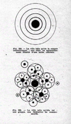 Al definir esta problemática es evidente que el término "edad" se vuelve un tanto impreciso por cuanto se constata una superposición temporal en relación con las tres "edades" definidas por Portzamparc, las cuales no son de ninguna manera estrictamente consecutivas. En dicha "edad 1,5" podemos encontrar conceptos que escapan tanto a la tiranía de la composición a gran escala -ya sea en su versión beauxartiana, o en su versión funcionalista-, como también a la noción ilustrada por Godard en Deux ou trois choses que je sais d'elle. Una de estas alternativas fue aquella concebida por Gaston Bardet (1907-1989), un urbanista apasionado y crítico furibundo de los modernos -muy cercano del historiador Marcel Poete (1866-1950) de quien fuera su exégeta además de su yerno-, que optaba por una convergencia entre la morfología social y la morfología urbana. La teoría de los "escalones" propuesta por Bardet permitía pensar la ciudad no solo como un ensamblaje de edificios, sino también como una combinación de colectividades que comparten los recursos de una aglomeración56 (Figura 27).
