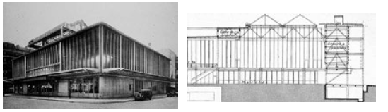 Un caso típico de sincronía entre modernidad y modernización es sin duda el de la Maison du Peuple construida en 1939 en Clichy (Figura 8) (comuna situada al noroccidente de París) por Eugéne Beaudouin (1898-1983), Marcel Lods (1891-1978), Vladimir Bodiansky (1894-1966) y Jean Prouvé. La estructura metálica ligera y transformable alberga a la vez un supermercado, una sala de cine en un entrepiso retráctil y las oficinas de las asociaciones locales (Figura 9). Aparecía así un nuevo tipo de equipamiento colectivo en el cual los autores del Centre Pompidou encontraron una de sus inspiraciones treinta años más tarde15.