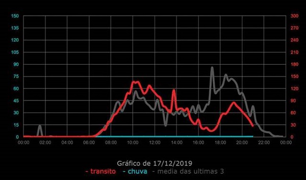 Con los datos referidos, el COR desarrolló un mapa de calor para indicar las zonas con más alto índice de tránsito lento. Además de eso, los datos de Waze pasaron a alimentar otras herramientas utilizadas en el COR. Una de ellas es el gráfico de tránsito que apunta en tiempo real el sumatorio de congestionamientos de la ciudad y lo compara con las condiciones de movilidad vial esperadas (mediante un promedio calculado con datos de las tres últimas semanas). En la Figura 1, la línea roja es el congestionamiento monitoreado en tiempo real, y la gris, el que se esperaba; los números en rojo indican la cantidad total de kilómetros de atascos en Río. Estos datos pueden ser monitoreados en el videowall de la sala de control; los gestores operacionales pueden accederlos, incluso, por teléfono móvil.