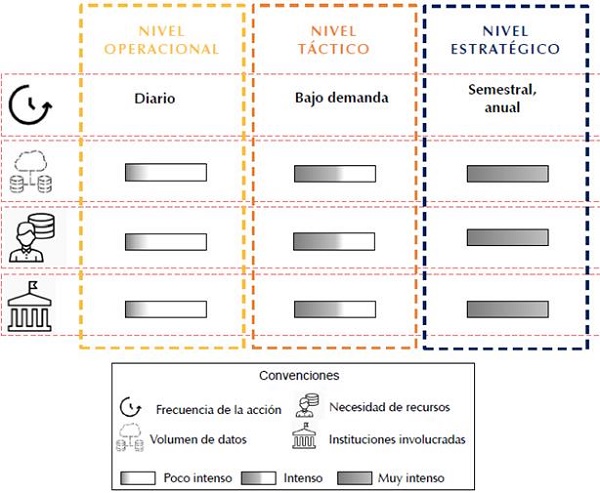 El primer nivel de uso de datos, denominado operacional, se caracteriza porque busca responder a eventos en tiempo real y mejorar la gestión operacional de la ciudad. Los datos son utilizados a diario para identificar la ocurrencia de eventos específicos que, sin una respuesta adecuada e inmediata, tienden a impactar de manera directa en el funcionamiento de la ciudad, la provisión de servicios públicos y la movilidad urbana. Por lo general, las acciones realizadas siguen protocolos predefinidos y una estructura de toma de decisiones de baja complejidad. Ejemplos de uso de datos en un nivel de análisis operacional son la gestión semafórica en Medellín y las respuestas y las acciones del COR en Río de Janeiro.