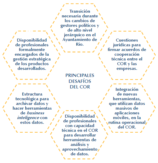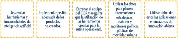 Actualmente, el principal reto del COR es habilitar los softwares utilizados en la gestión urbana para que recomienden, de forma proactiva y automática, las acciones predeterminadas por los procesos operacionales. Rara ello, el COR está trabajando en la identificación de situaciones clave, en la definición y la programación de parámetros básicos, alineados con un gran volumen de datos. Esta labor permitirá generar dos tipos de recomendaciones: para el equipo del COR, acciones alineadas con los procesos de respuestas a incidentes y emergencias urbanas, a partir de los sistemas tecnológicos; para los ciudadanos, mejores rutas u opciones de transporte público, con base en los datos de comportamiento diario de los usuarios (Waze, Moovit y sistemas de transporte público). Los desafíos actuales del COR se muestran en la Figura 4.