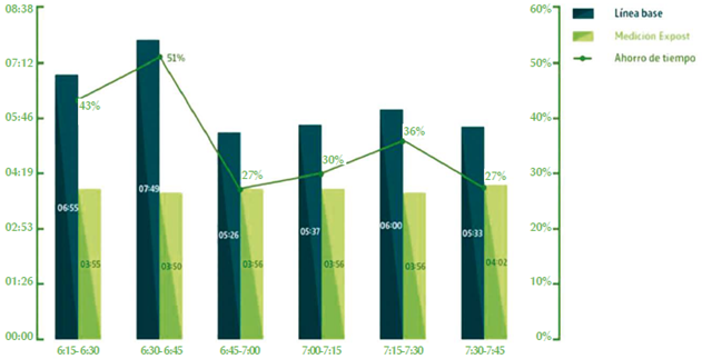 El equipo del CIOS hizo estudios para evaluar el impacto de los cambios en el plan semafórico sobre la velocidad de las vías y la relación de dichos cambios con los datos posteriormente emitidos por Waze. A partir del método de vehículo flotante (Vargas & Sánchez, 2002, p. 8)4, se pudo percibir que al utilizar los datos de Waze para ajustar la programación semafórica se alcanzaron ahorros de tiempo en el recorrido; ello, debido a los mayores tiempos de luz verde en áreas congestionadas y a la disminución de la longitud de la cola de vehículos detenidos. Los ahorros de tiempo ocasionados por la nueva estrategia llegaron al 51 % entre las 6:30 a. m. y las 6:45 a. m., como se evidencia en la Figura 5.