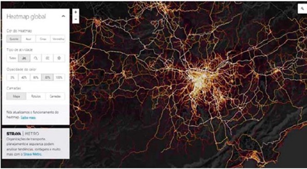 La ciudad de São Paulo innovó en la utilización de datos masivos para beneficiar la movilidad activa. La alianza con Strava -una aplicación utilizada por ciclistas para registrar los tramos recogidos- permitió a la ciudad comprender mejor el uso de la bicicleta y mejorar la planeación para construir ciclorrutas. En São Paulo, la aplicación cuenta con cerca de 90.000 usuarios (Avelleda, 2018). Los mapas de calor generados por Strava son utilizados para evidenciar la demanda de espacio público por parte de los ciclistas y para visualizar las rutas más utilizadas. Avelleda (2018) afirma que la información de Strava es de gran utilidad para dar visibilidad al ciclista, comprobar y convencer a la población de la importancia de mantener ciclorrutas en determinadas vías donde se creía que el flujo de ciclistas era irrelevante. La Figura 7 muestra el mapa de calor generado en Strava.