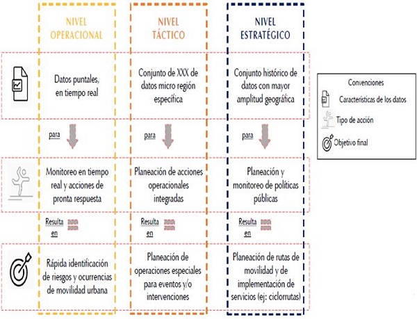 Los niveles de análisis presentados (operacional, táctico y estratégico) son la base del modelo preliminar planteado que sugiere una ruta para los gobiernos locales hacia el uso de datos masivos de apps de movilidad con el fin de generar, progresivamente, impactos positivos para la gestión urbana; ello, porque, si bien parece claro el potencial de los datos para primorear las políticas públicas de movilidad, en la práctica existen obstáculos que necesitan ser mapeados y requieren planes de trabajo efectivos.