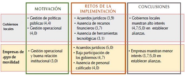 Por otra parte, según la encuesta, la sinergia entre gobiernos y empresas se cuestiona cuando los gobiernos locales afirman tener alto interés en establecer las alianzas, pero las empresas de apps destacan la baja participación de los gobiernos como un reto para consolidar las alianzas. Este es otro elemento que reafirma la necesidad de seguir investigando el tema y la posición de ambos actores.