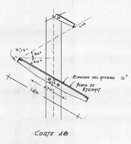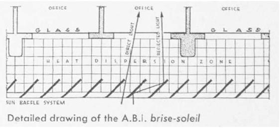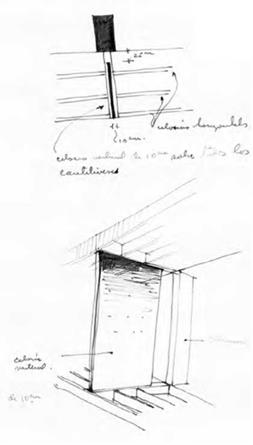 El brise-soleil no es aquí de hormigón. Se trata de láminas de fibrocemento de la marca Eternit15, de 10 cm de espesor, que el propio Moya representa a través de una perspectiva en el margen de uno de sus planos (Figura 9), a mano alzada, aunque sin hacer un detalle del sistema de fijación. En el dibujo de la Figura 9 se representan también las lamas (celosías horizontales) confinadas entre los cantiliveres.