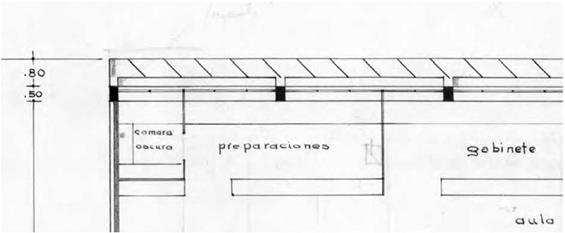Por su parte, el salón de actos (C) tiene una disposición que orienta el ingreso del público sobre un área de llegada para los vehículos, se levanta sobre pilotes de tal manera que habilita en la planta baja un estacionamiento cubierto y aisla del público al edificio D, concebido, a su vez, como pabellón de dormitorios que no llegó a contar con planos definitivos, a tal punto que ni siquiera aparece representado en la perspectiva que se hizo del conjunto en 1947, y en la cual ya está claramente expresada la preocupación de Juvenal Moya por el tema del asoleamiento (Figura 7).