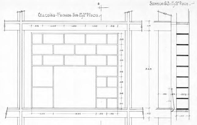 No obstante lo expuesto, es probable que en el proceso constructivo, y por razones relacionadas con la estabilidad de las celosías19, se haya hecho necesario disminuir el tamaño de las aberturas más grandes (de 2 X2ma1 x1 m), y que todas se vincularan entre sí prolongando los planos verticales y horizontales, conservando la modulación y creando, en conjunto, una segunda piel del edificio en toda la extensión de la fachada sur, continua, pero separada 25 cm de la cara exterior de las columnas, y solo interrumpida en los volúmenes correspondientes a las escaleras (Figura 16).