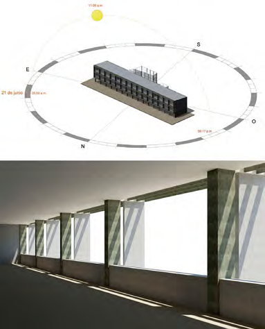 La orientación del edificio de aulas no se realiza con la dirección exacta este-oeste, girándose levemente, haciendo que la fachada norte, principal fuente de iluminación natural, presente una rotación de 1 7° hacia el este, para así favorecer la ganancia térmica por radiación directa en horas de la mañana (cuando la temperatura del aire es más baja) y evitar la entrada de sol a los espacios de aulas en horas de la tarde.