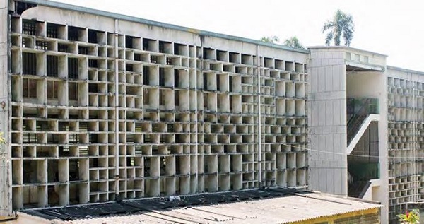 El edificio de aulas tiene 80 m de longitud y está dividido en 16 módulos de 5 m de ancho entre ejes de columnas cuya sección alcanza los 30 cm x 50 cm. En sentido contrario, las columnas están separadas a ejes por una distancia de 9,5 m, de tal manera que los espacios interiores quedan con una distancia libre de 9 m.