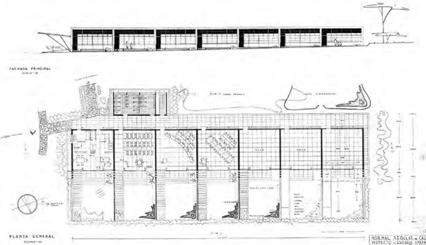 ¿Cuáles son los vasos comunicantes entre lo anterior y el edificio de la Escuela Normal Regular de Cali (ENRC), que se considera aquí objeto de estudio? Por una parte, su autor, el arquitecto Juvenal Moya Cadena, desarrolló a lo largo de su truncada carrera profesional una obra caracterizada por dos momentos en los que la influencia brasilera es perfectamente notable, lo cual se describirá más adelante; por otra, él fue discípulo de Rother8 en las aulas de la Universidad Nacional, de quien seguramente captó la preocupación que este sentía por la relación entre arquitectura, paisaje y clima.