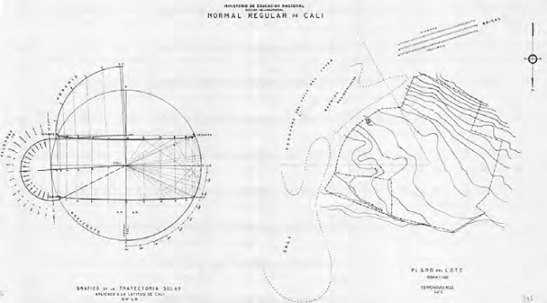 ¿Con qué herramientas proyectuales contaba Juvenal Moya en la concepción de este edificio? Uno de los planos firmados por él para la ENRC deja en evidencia el uso de uno de los recursos más importantes empleados en diseño de las envolventes: una carta solar (Figura 18), muy probablemente construida por él mismo y dispuesta al lado izquierdo de una planta del predio en escala 1/1000 con indicación del norte geográfico, el sentido de las brisas (diurnas y nocturnas) y la posición de las visuales lejanas que en plano aparecen rotuladas como el panorama del Valle del Cauca. La carta, o Gráfico de trayectoria solar, está construida para las condiciones de la ciudad de Cali, a latitud norte 3o 4' y constituye, hasta ahora, la primera evidencia conocida del uso de esta herramienta en Colombia.