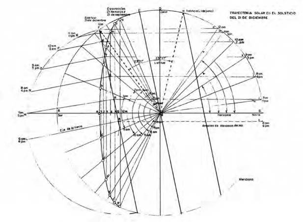 En la Figura 18 (tipo Fisher-Mattioni) se representa el recorrido del sol en la bóveda celeste, y fue construida en un sistema diédrico, haciendo operaciones sencillas de geometría descriptiva, sobre la base de un profundo conocimiento de la mecánica de la trayectoria solar. Mediante la proyección ortogonal de los arcos de recorrido solar sobre un plano de horizonte, la gráfica de la Figura 18 permite determinar la posición del sol en un momento determinado, así como el ángulo de incidencia solar sobre cada uno de los planos que conforman la envolvente de un edificio.