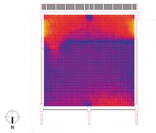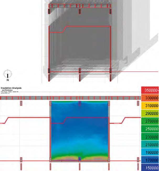 Una simulación de la manera como las dos fachadas diseñadas por Juvenal Moya respondían a las condiciones de asoleamiento se aprecia en las Figuras 12y13, considerando de manera precisa la latitud y la longitud del emplazamiento y las condiciones más críticas: el asoleamiento el 21 de junio para la fachada norte a las 11:00 a. m.17 (Figura 14) y el 21 de diciembre para la fachada sur a las 4:00 p. m.18 (Figura 15). En ambas Figuras se puede apreciar el área del piso que recibe directamente el sol, la cual es mínima en ambos casos: el 0,9% del área total del piso afectada por el sol que incide sobre la fachada norte el 21 de junio a las 11:00 a. m., y el 3,8 % de área total del piso afectada por el sol que incide sobre la fachada sur el 21 de diciembre a las 4:00 p. m.