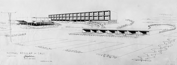 Los trabajos de construcción empezaron en 1947, gracias a una partida de $180.000 entregada por el Fondo Escolar Nacional a la Gobernación del Departamento del Valle del Cauca, y se asignaron mediante licitación a la oficina conformada por los arquitectos Guillermo Lemos y Edmond Cobo; sin embargo, los recursos no fueron suficientes para la terminación del proyecto en su totalidad, de tal manera que en 1948 solo se abrieron al servicio el pabellón de enseñanza y la escuela anexa (Ramírez, 1948, p. 16). La sala de actos y el edificio para residencias jamás se construyeron.