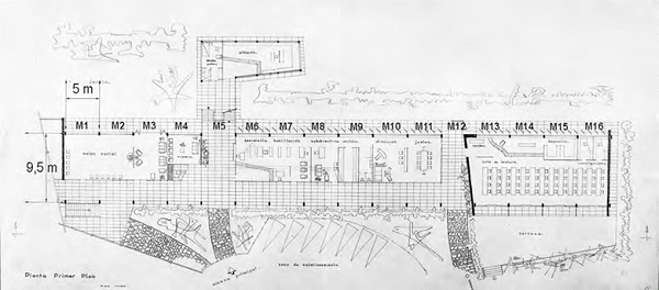 Por último, el edificio de la escuela anexa estaba destinado a atender a los niños más pequeños y se comunicaba con el edificio de aulas a través de un camino cubierto dotado de una suave pendiente. Estaba conformado por 7 módulos (uno para cada aula) de 9 x 9 m, a los cuales se llegaba por un corredor cubierto con un alero de 3 m de ancho situado en la cara sur. Por el lado contrario, cada módulo estaba dotado de un jardín independiente, descubierto, de 10,5 m de profundidad destinado para clases al aire libre (Figura 17). Entre cada aula y el jardín se conformaba un pequeño espacio de transición de 2 m de ancho, cubierto con celosías horizontales a manera de quiebrasoles y que generaban sombras sobre el plano vidriado de acceso.
