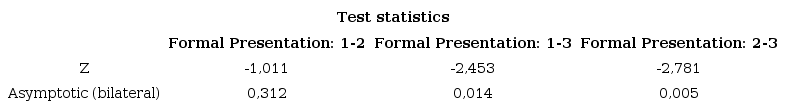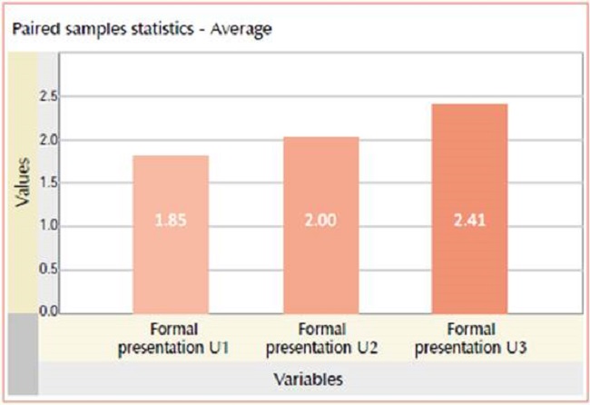 In the specific dimensions, similar to the general analysis, it is observed that for the formal presentation dimension the results of the project imprint at the start of each unit and of the statistical analysis of the first and second one, the first and the third one; the second and third show that in the first unit prior knowledge is not surpassed in the formal presentation dimension; and for the second and third units, the adaptation stage has been overcome as regards the application of project research as a didactic strategy.