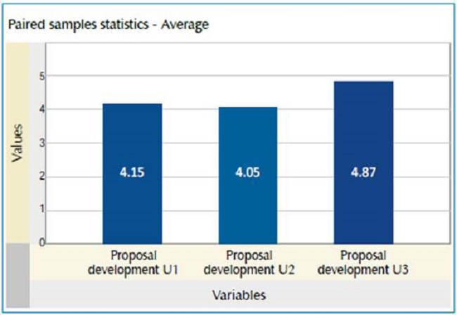 In the proposal development dimension, results of the project imprint were compared at the start of each unit, and the statistical analysis shows that in the first and second unit their previous knowledge is not surpassed, and for the third unit, the adaptation stage has been overcome regarding the application of project research as a didactic strategy.