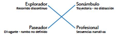 Un segundo instrumento empleado en este proyecto, y que permitió establecer con claridad roles, gracias a las relaciones contrastantes en el entorno y los intereses de los transeúntes, fue el cuadrado semiótico: una propuesta de Marrone (2011), representada en la figura 3. Este ejercicio se ve manifestado en la figura 4, donde puede verse la incidencia de las intencionalidades en relación con las potencialidades de cada subespacio.