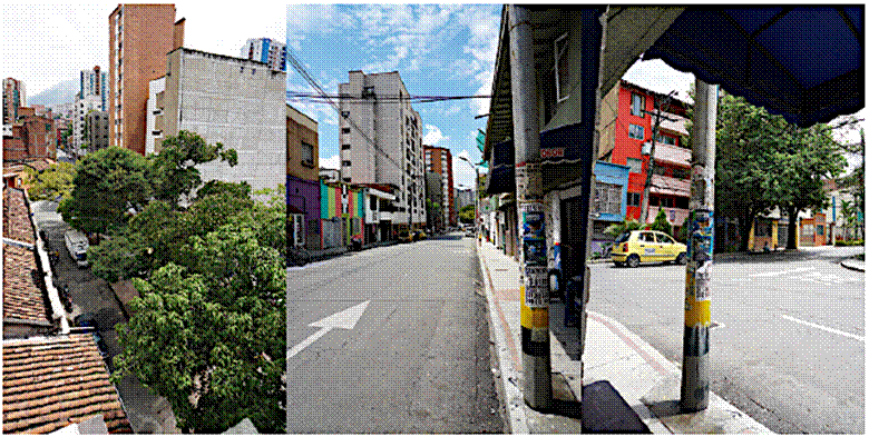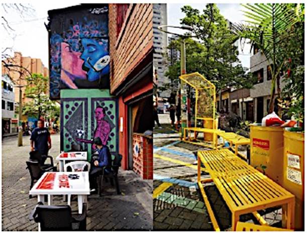 Se toma como referente de ocultamiento simbólico el tramo que corresponde a la carrera 42 A con la calle 48, tal cual se ve en la figura 5, y que, en la configuración de imaginarios, se ubica entre las torres de Bomboná y la avenida Ayacucho. Dicho espacio está configurado como un callejón abierto, en el cual se da cita una serie de dinámicas urbanas particulares, ya que es desde los dispositivos vernáculos y los autónomos de donde devienen los procesos de habitabilidad e identidad (Figura 6). Por ello, las relaciones simbólicas que propone el mencionado espacio están determinadas por el flujo discontinuo presente en todo el trayecto, y el cual propone un ritmo zigzagueante entre los dispositivos estéticos y los intersticios que allí confluyen. Una dinámica que invita a quien territorializa el espacio a sentirse oculto, mas no escondido, gracias a una serie de trazas que devienen en marcas de identidad propias del espacio, ofrecido como un lugar amigable para la interacción con otros sujetos. Estas trazas, al observarlas, funcionan como evidencias de que sobre el espacio se ejerce una habitabilidad activa y fluctuante, la cual es propuesta por los objetos y los elementos físicos propios de la estructura urbana dispuestos allí, y que, a partir de una vocación mutable en el tiempo y en el espacio, modifican los procesos de apropiación y las relaciones simbólicas que sobre ellas son ejercidas.