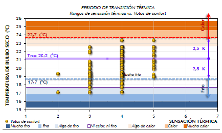 El rango térmico de confort estimado para espacios interiores con ventilación natural para la transición térmica del periodo frío al periodo cálido en Ensenada, Baja California (bioclima templado-seco), es de 17,7 °C-22,7 °C (5,0 K), con una temperatura óptima ambiental de 20,2 °C. La amplitud térmica obtenida estadísticamente para cada una de las tres sensaciones térmicas frías se estimó en 0,8 K acumulativos por debajo del rango de confort térmico, mientras que la obtenida para cada una de las tres sensaciones térmicas cálidas se estimó en 1,0 K acumulativos por encima del rango de confort térmico, lo cual permite conocer que las condiciones térmicas de evaluación del periodo de estudio fueron favorables para el 96 % de las personas evaluadas en sitio; por ende, dichas condiciones son aceptables para prácticamente el total de la población a partir de la adecuación eventual de su entorno inmediato y el emprendimiento simbólico de ciertas acciones en la búsqueda constante del confort térmico.