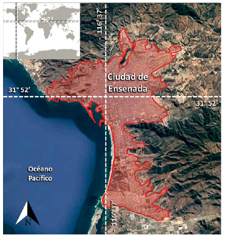 El estudio se realizó en la ciudad de Ensenada, localizada en la costa noroeste del estado de Baja California, México; a 90 km al sur de la frontera con Estados Unidos y con horizonte visual al Océano Pacífico (INEGI, 2009), tal como se muestra en la figura 1.
