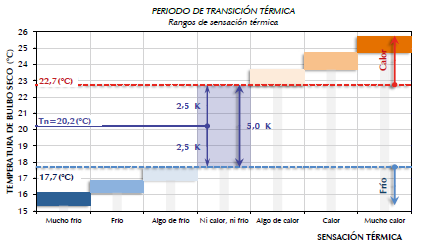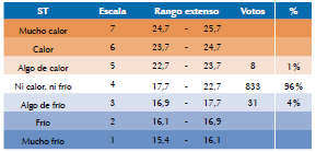 Desde el punto de vista estadístico, el rango reducido de confort (± 1 DS) incluye al 68,3 % de la población analizada, y el rango extenso de confort (± 2 DS), al 95,5 % de ella. Con ello, en la figura 9 se presenta la amplitud térmica de cada categoría de ST calculada estadísticamente a partir únicamente del rango extenso. Esta amplitud se obtiene al cruzar las RLS de cada uno de los límites del rango extenso con cada una de las categorías de ST ubicadas en el eje de las ordenadas, como se ve en la figura 8. La amplitud térmica estimada para las ST frías fue: a) Mucho frío, de 15,4 °C-16,1 °C; b) Frío, de 16,1 °C-16,9 °C, y c) Algo de frío, de 16,9 °C-17,7 °C; con una amplitud constante de 0,8 K. Por su parte, la amplitud térmica estimada para las ST cálidas fue: a) Algo de calor, de 22,7 °C-23,7 °C; b) Calor, de 23,7 °C-24,7 °C, y c) Mucho calor, de 24,7 °C-25,7 °C; con una amplitud constante de 1,0 K, todo lo cual se expresa en la figura 9.