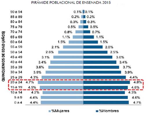 De acuerdo con el Comité de Planeación para el Desarrollo (COPLADE, 2015), la ciudad de Ensenada tenía una población de 520.000 habitantes para 2015. De ella, el groso poblacional se concentra en los quinquenios de edad de 15-19 años y de 20-24 años, tal cual se expresa en la figura 2. Los puntos de encuentro en los que se puede visualizar mayor afluencia de jóvenes adultos de dicho grupo etario son los centros de educación de nivel medio superior y nivel superior.
