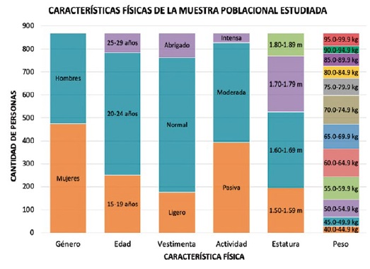 En Ensenada, la Universidad Autónoma de Baja California (UABC) es la institución pública que aloja al 60 % de la matrícula estudiantil de educación superior. Por ello, la población blanco atendida en el presente estudio corresponde a la comunidad estudiantil de la UABC compuesta por jóvenes adultos de entre 18 y 23 años, con actividad sedentaria (1,2 met, de acuerdo con la ISO 8996, 2004) y una resistencia térmica por arropamiento de 1,0 clo (ANSI/ASHRAE 55, 2017), en promedio; son habitantes de espacios interiores naturalmente ventilados. La estratificación de la muestra poblacional estudiada según sus características físicas se presenta en la figura 3.