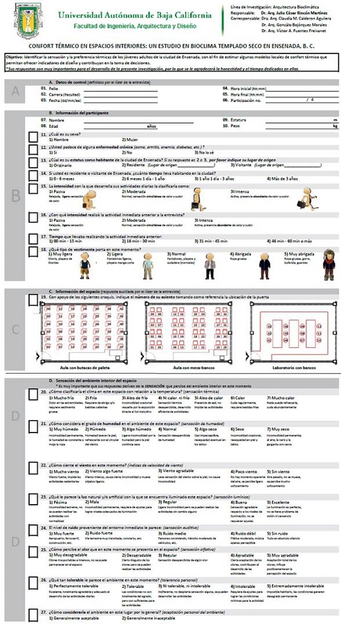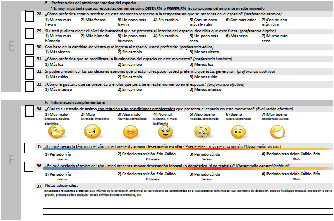 El cuestionario fue diseñado en seis secciones y 37 preguntas, como se muestra en las figuras 4 y 5. Las preguntas relacionadas con la sensación térmica del ambiente se basaron en la escala subjetiva de siete puntos contenida en la ISO 10551 (International Organization for Standardization, 1995) y la ANSI/ASHRAE 55 (2017), y fue adaptada como se indica en la tabla 1.