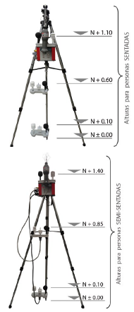 Los espacios de evaluación fueron aulas de clase, laboratorios y talleres de dibujo. En el primero de los casos, se trata de lugares donde el mobiliario consta de butacas con paleta o mesabancos y, por ende, las personas permanecen sentadas. El equipo de medición se ubicó en el centro del aula, con las siguientes alturas sobre el nivel de piso terminado: 0,1 m, 0,6 m y 1,1 m, correspondientes a las alturas promedio del talón, el abdomen y la cabeza de una persona sentada (ISO 7726, 1998; ANSI/ASHRAE 55, 2017). Mientras, en los laboratorios y los talleres, donde el plano de trabajo se encuentra a una altura de 1,2 m y las personas descansan sobre bancos de 0,9 m de altura, las alturas adaptadas fueron: 0,1 m, 0,85 m y 1,4 m, respectivamente, ya que no fue posible considerárselas sentadas ni de pie, según lo ilustra la figura 6.