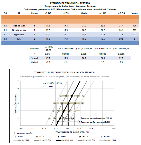 El procesamiento de datos se llevó a cabo con el método estadístico denominado medias por intervalos de sensación térmica (MIST), desarrollado por Gómez-Azpeitia et al. (2007). Este método consiste en agrupar los votos de confort por categoría de sensación térmica (ST) y obtener la media de la variable ambiental en cada caso; agregar y sustraer ± 1 desviación estándar (DS) (rango de confort reducido) y ± 2 DS (rango de confort extenso) a la media de cada nivel; graficar los pares de datos obtenidos y trazar las líneas de regresión simple; la Tn y los rangos de confort resultan del cruce de estas y el nivel cuatro de ST.