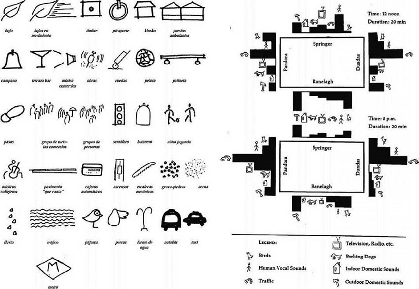 La primera fase es más descriptiva, y comprende tres aspectos del paisaje sonoro; a saber: marco temporal, localización espacial y fuente sonora. El factor tiempo se asume bajo el concepto de patrones temporales, los cuales se entienden como indicadores gráficos que muestran la franja horaria y la frecuencia de emisión de un sonido (Southworth, 1967). Como se observa en la figura 1, el factor espacial se aborda a través del concepto de cartofonía; es decir, una cartografía o mapa sonoro en el que se localizan, de manera aproximada, cada uno de los objetos emisores de sonido presentes en un espacio, y simbolizados con un ícono que los distingue (Schafer, 2005, citado por Temtem, 2016, p. 206), como recurso para representar gráficamente los sonidos, idea que se retoma para la creación de los íconos propuestos en la presente investigación.